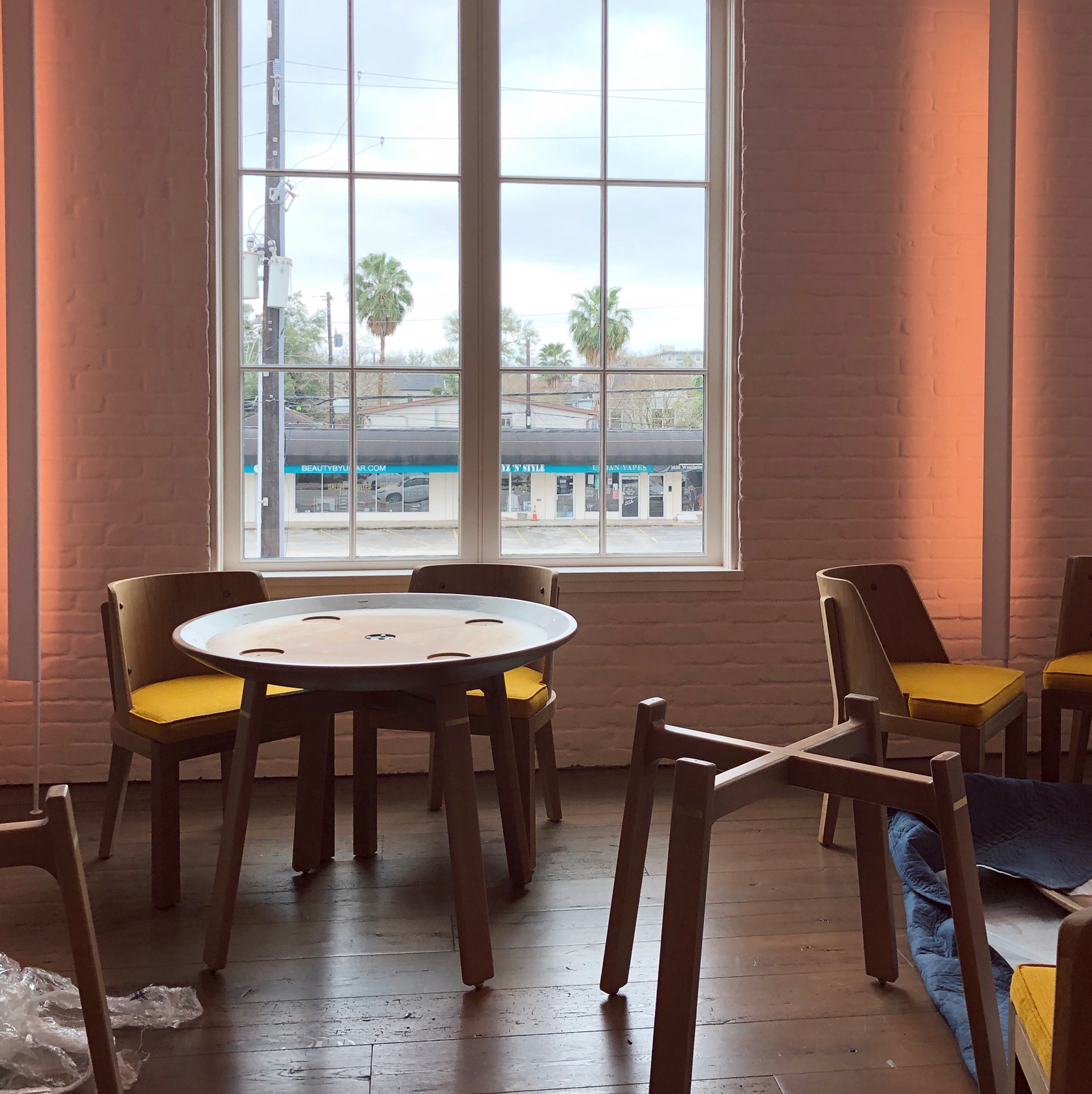 The March Table is currently manufactured in a 2-person table, 4-person table, and also a pedestal version for a larger, and more flexible number of seats. The pedestal March table is also adaptable to a 10-foot banquet table with the same clean-linen top aesthetic.